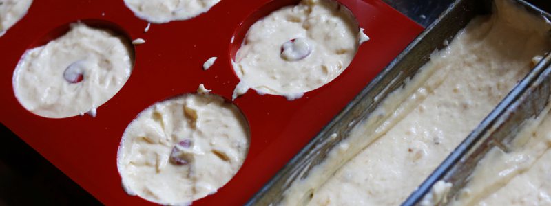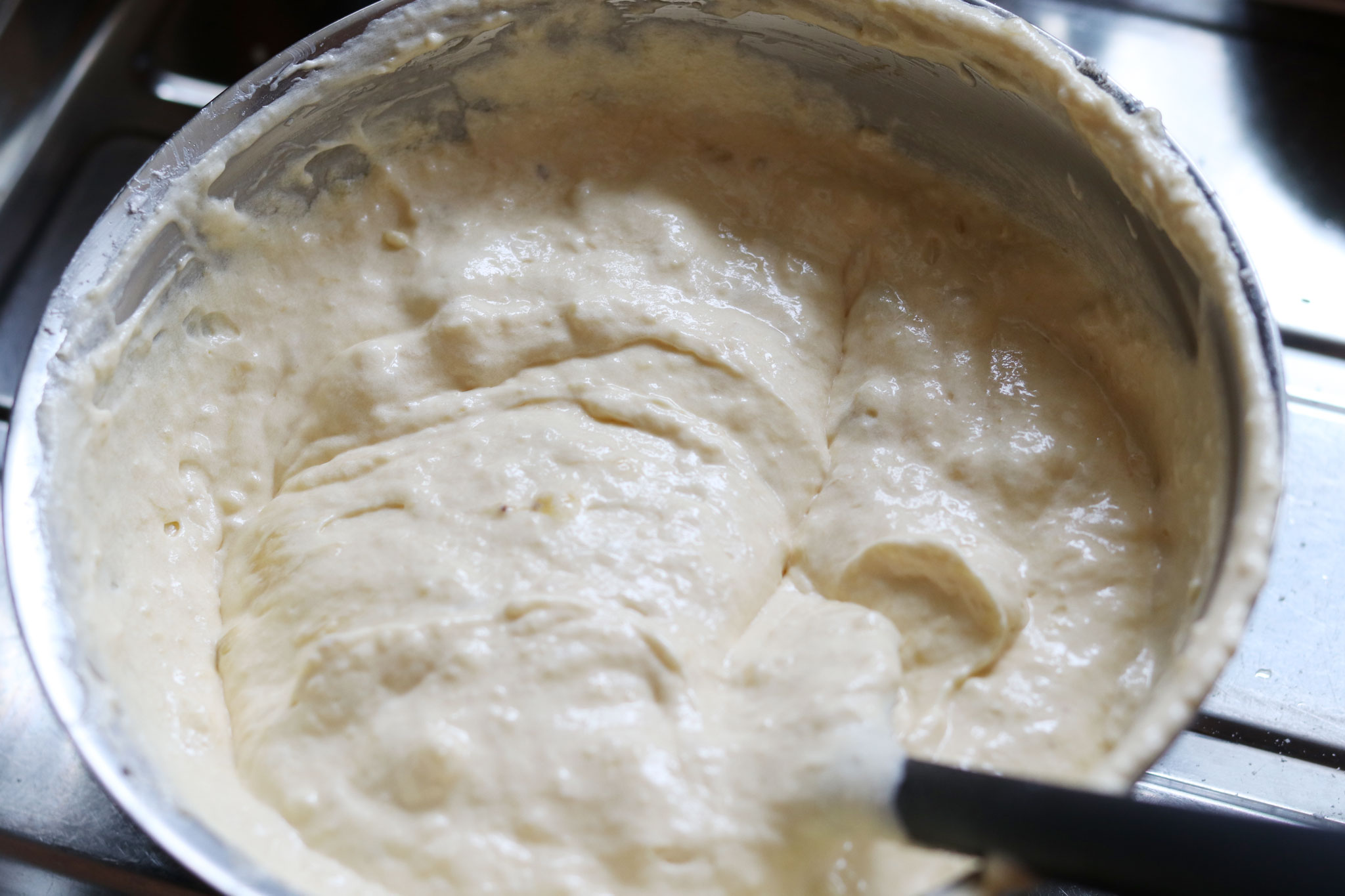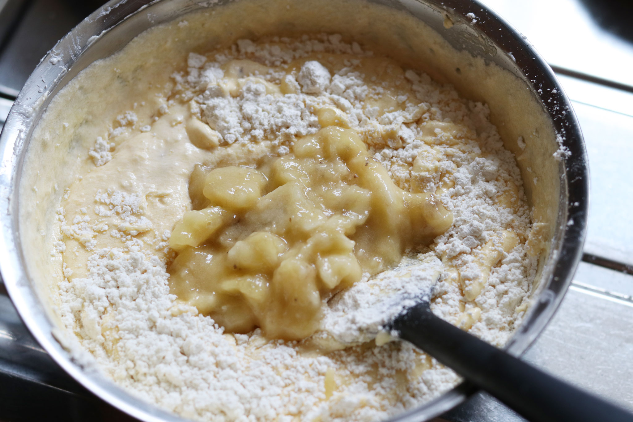 最初に粉(小麦粉とベーキングパウダーを合わせてふるったもの)の1/3を軽く混ぜて、次につぶしたバナナの1/2を入れて混ぜます。再び1/3の粉、バナナの残り、その後残りの粉を入れておしまい!