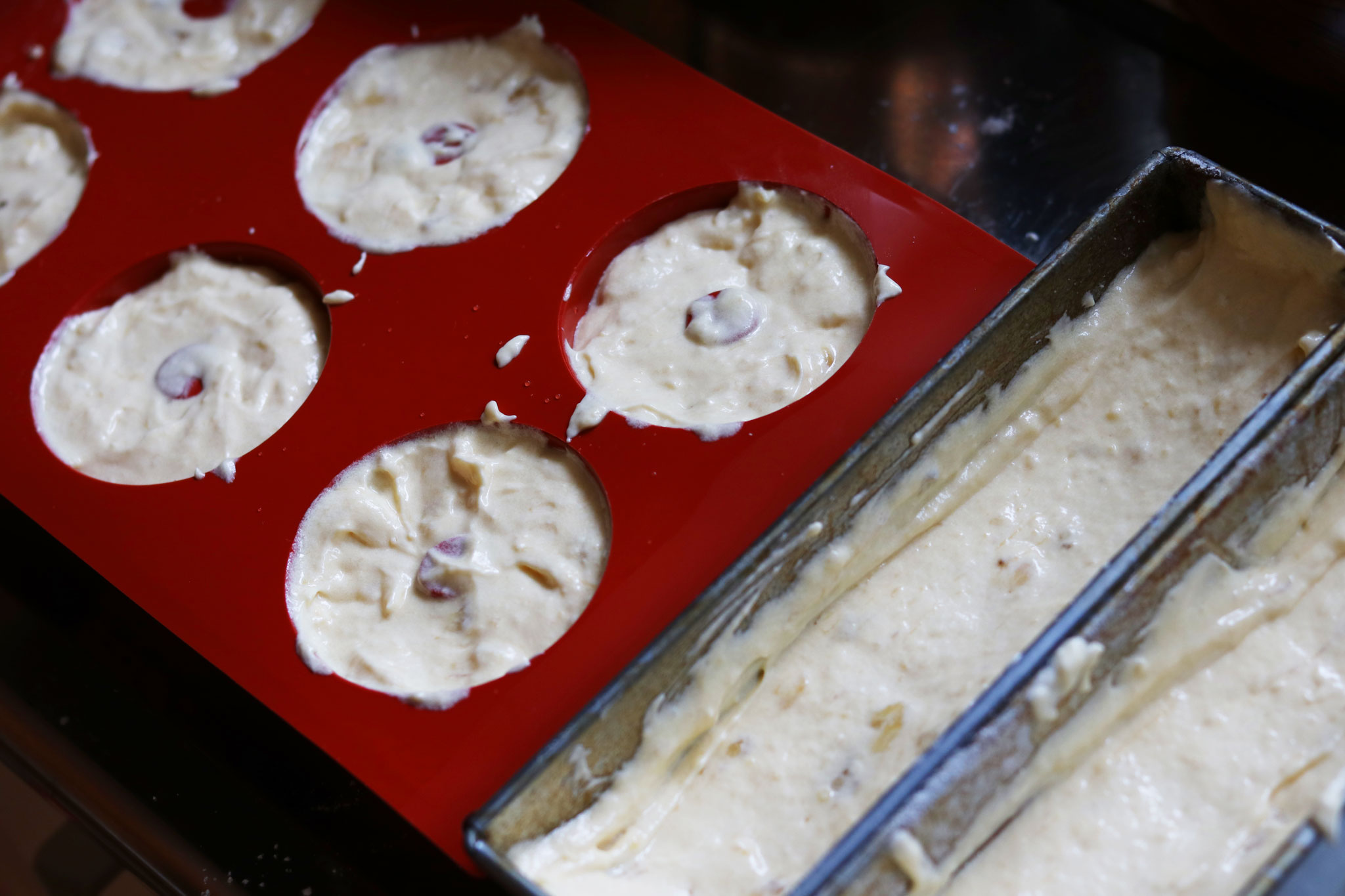 180℃に温めたオーブンで25分間焼きます。温度と時間は使うオーブンや型によって多少変わると思うので調節してくださいね。今回、型はブリキのパウンド型と、シリコンのクグロフ型を使用しました。