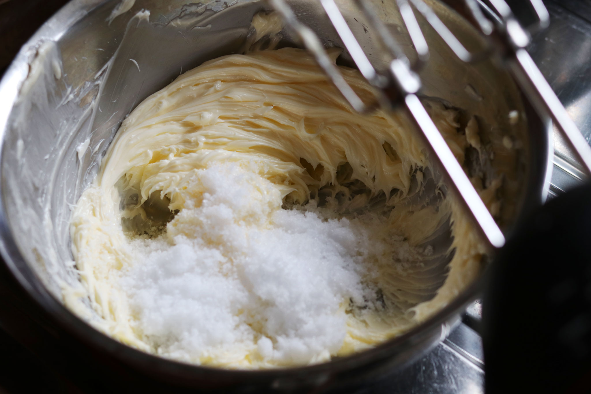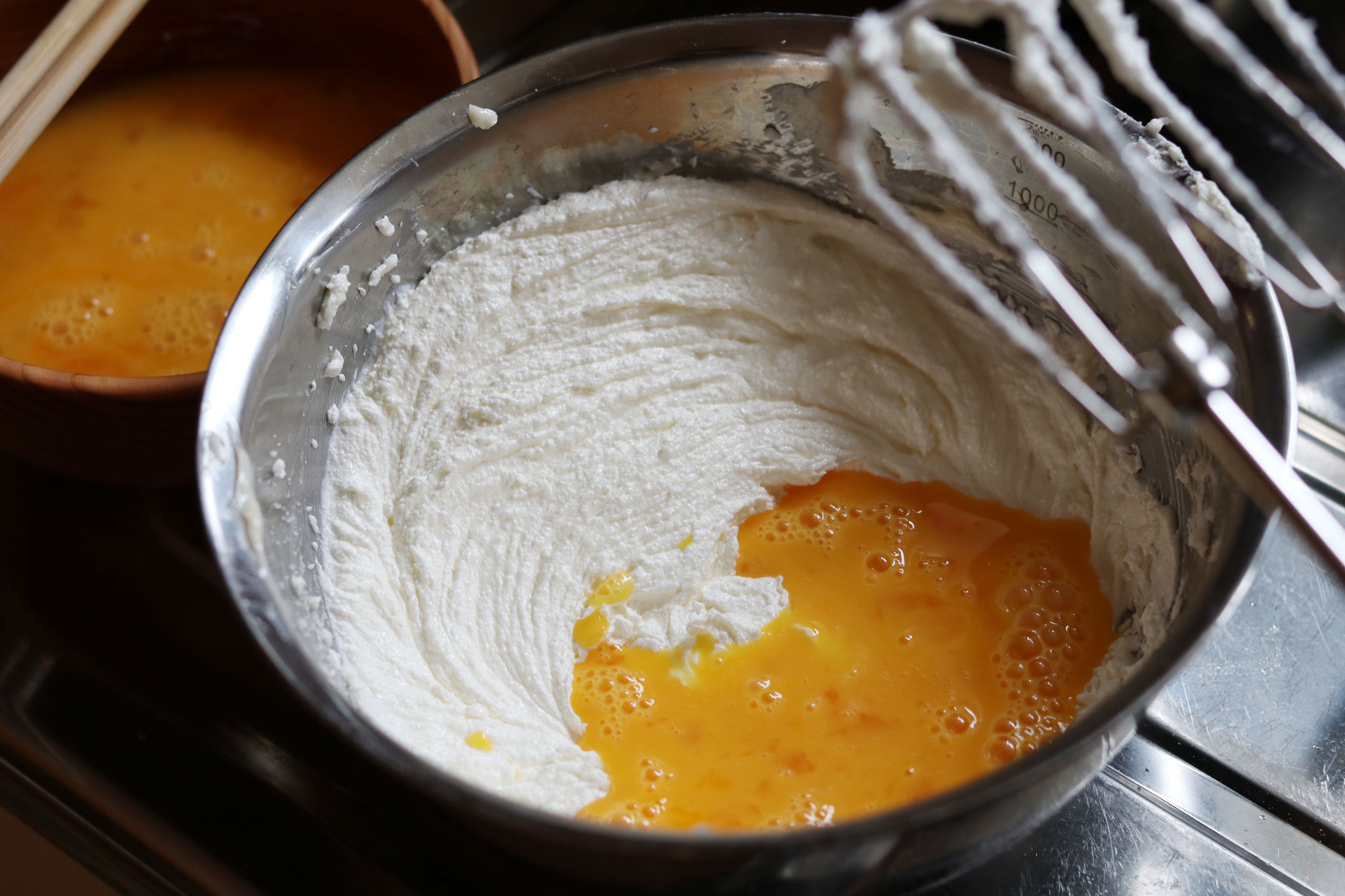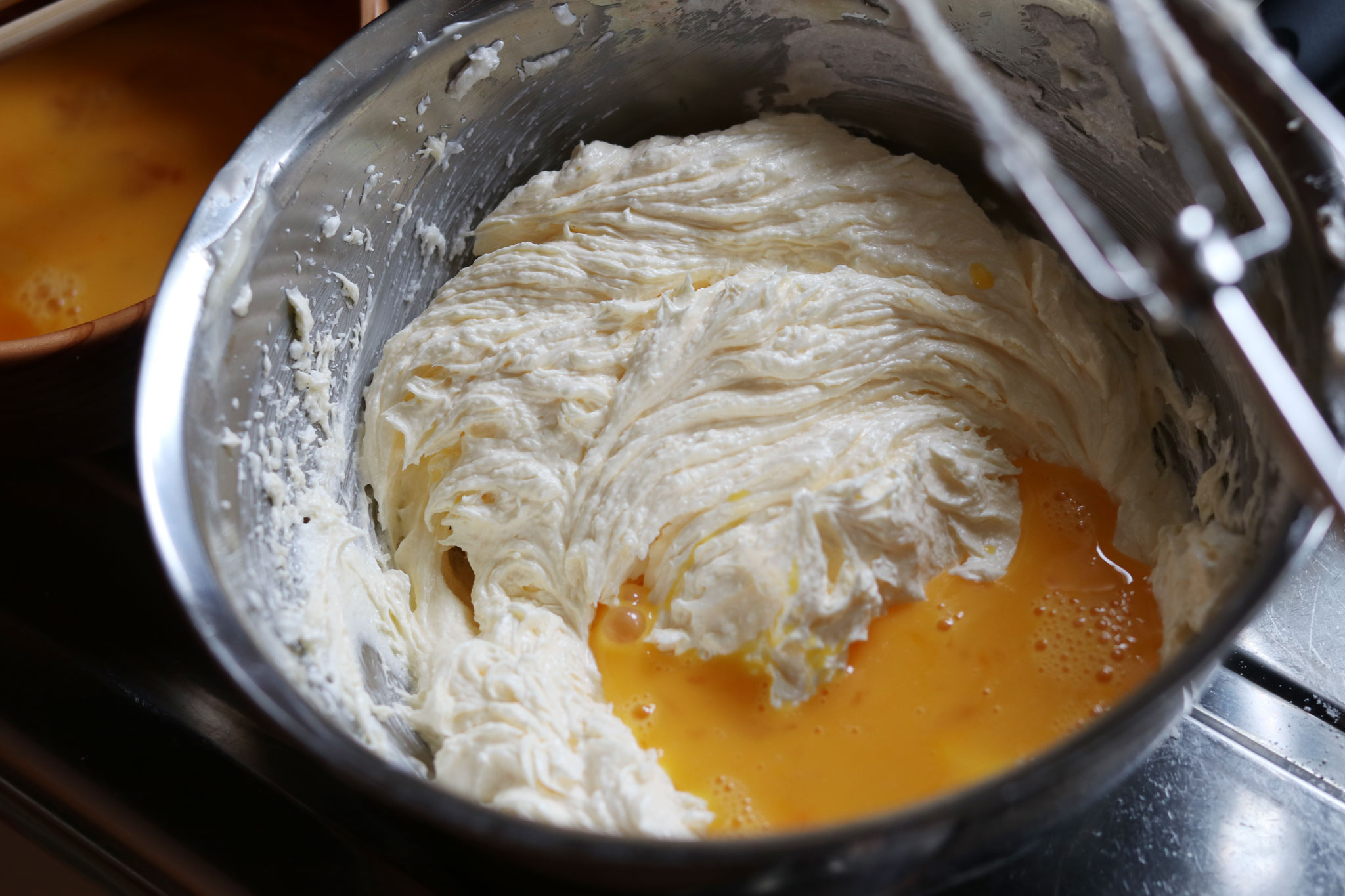 ふわっふわに泡立てたバターに、溶いた卵を少しずつ加えては混ぜる、加えては混ぜるを繰り返します。