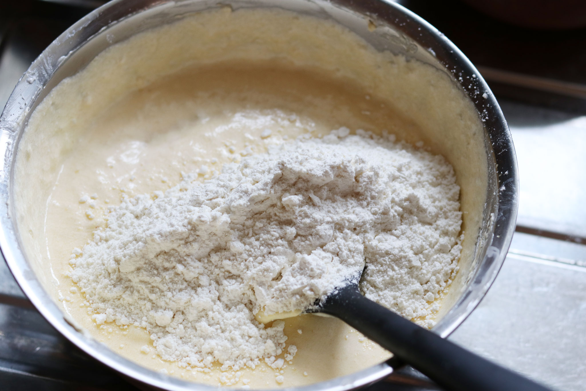 粉からはゴムベラでさっくりと。粉っぽさがなくなって生地につやがでたらOK!