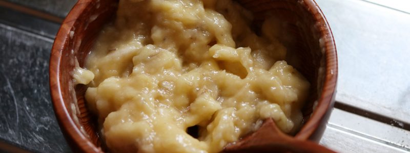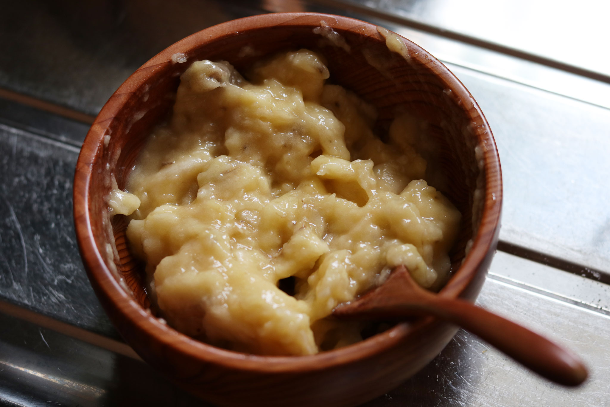 バナナ、つぶします!! 完熟なので割と簡単につぶれました。おいしそうなにおいがする……。