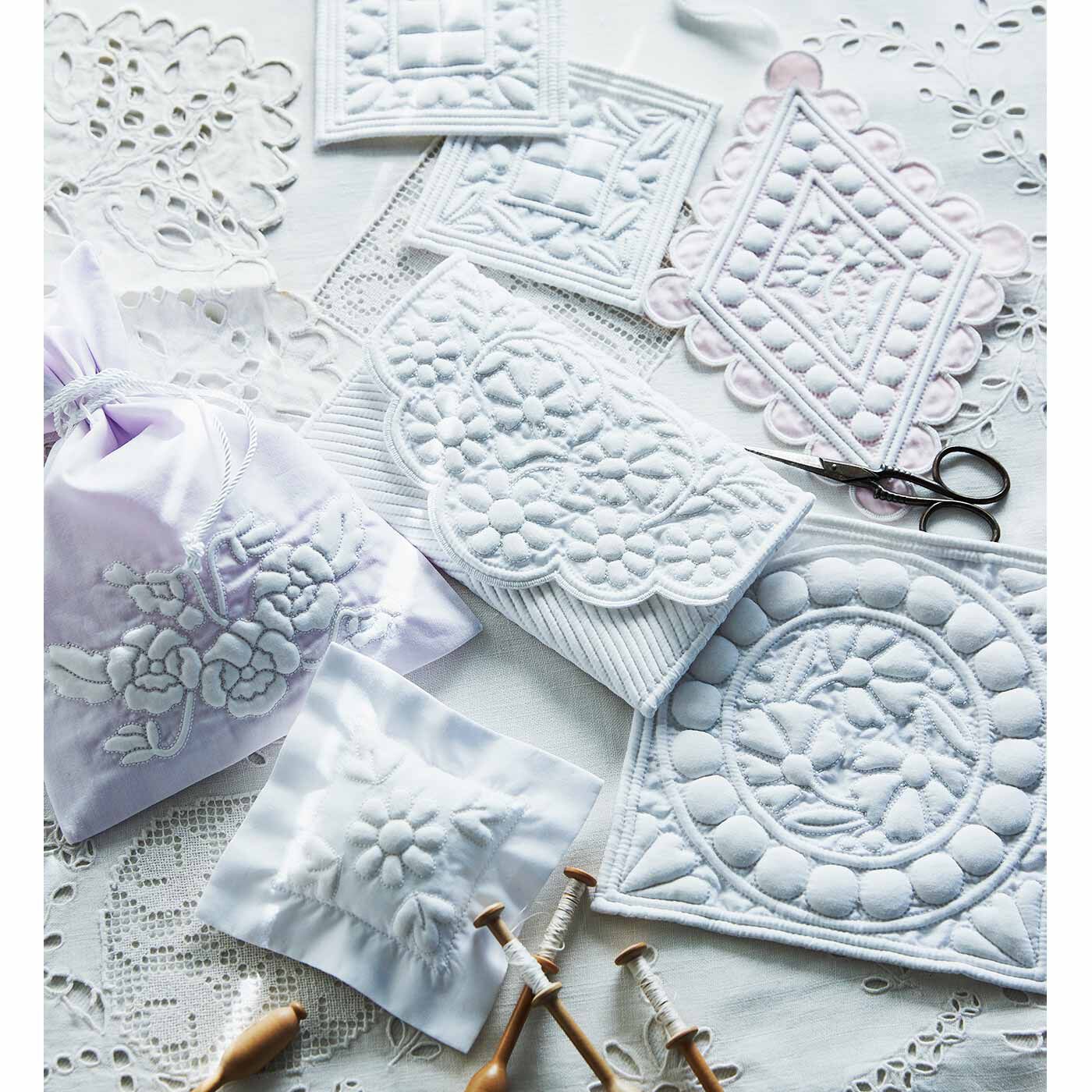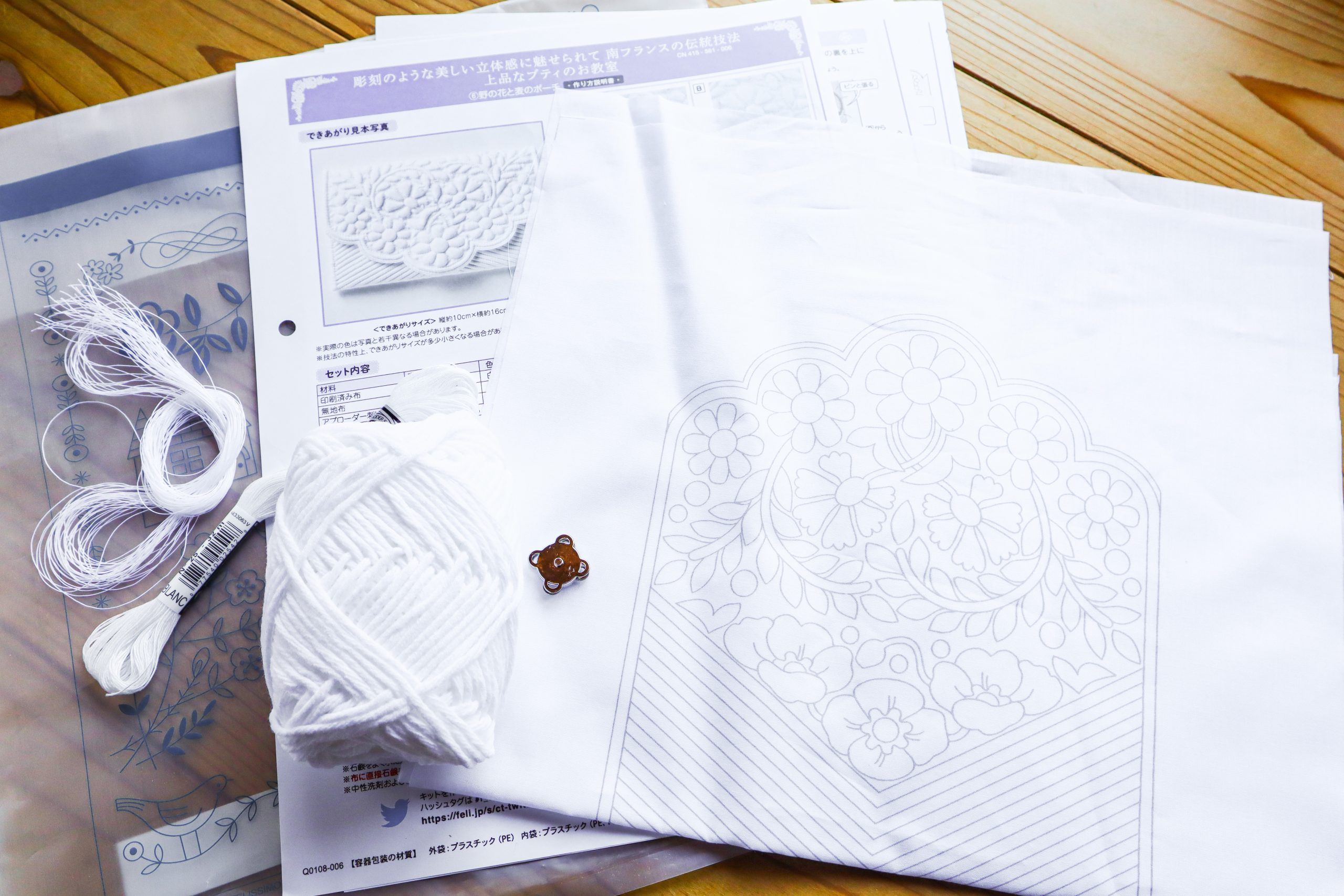 A3二つ折りカラーの説明書が3枚、図案が印刷された刺繍用の表地1枚、白無地布1枚、刺繍糸1カセ、キルト糸、コーディング用糸1玉、マグネットホック1個がセットになっていました。