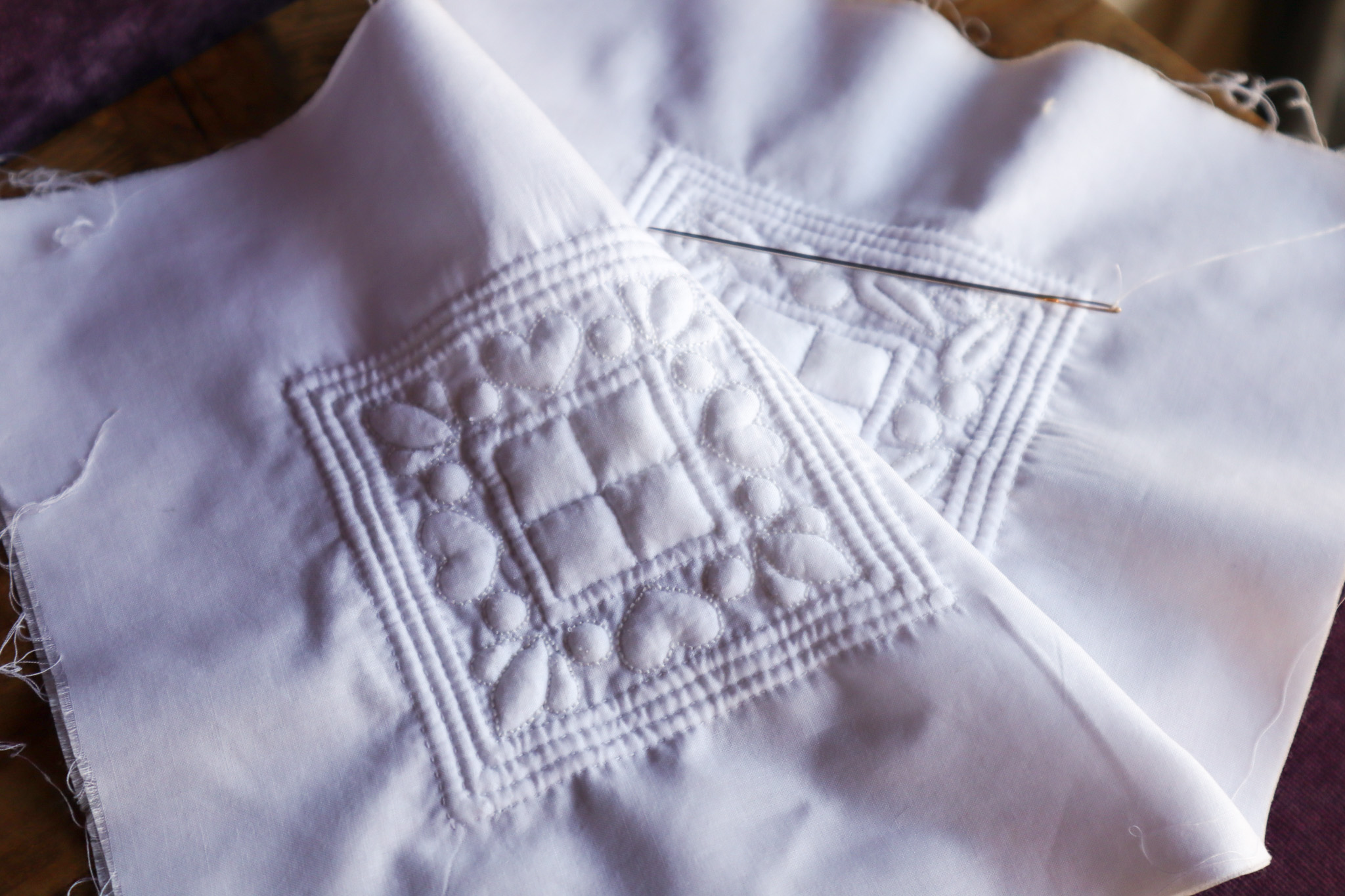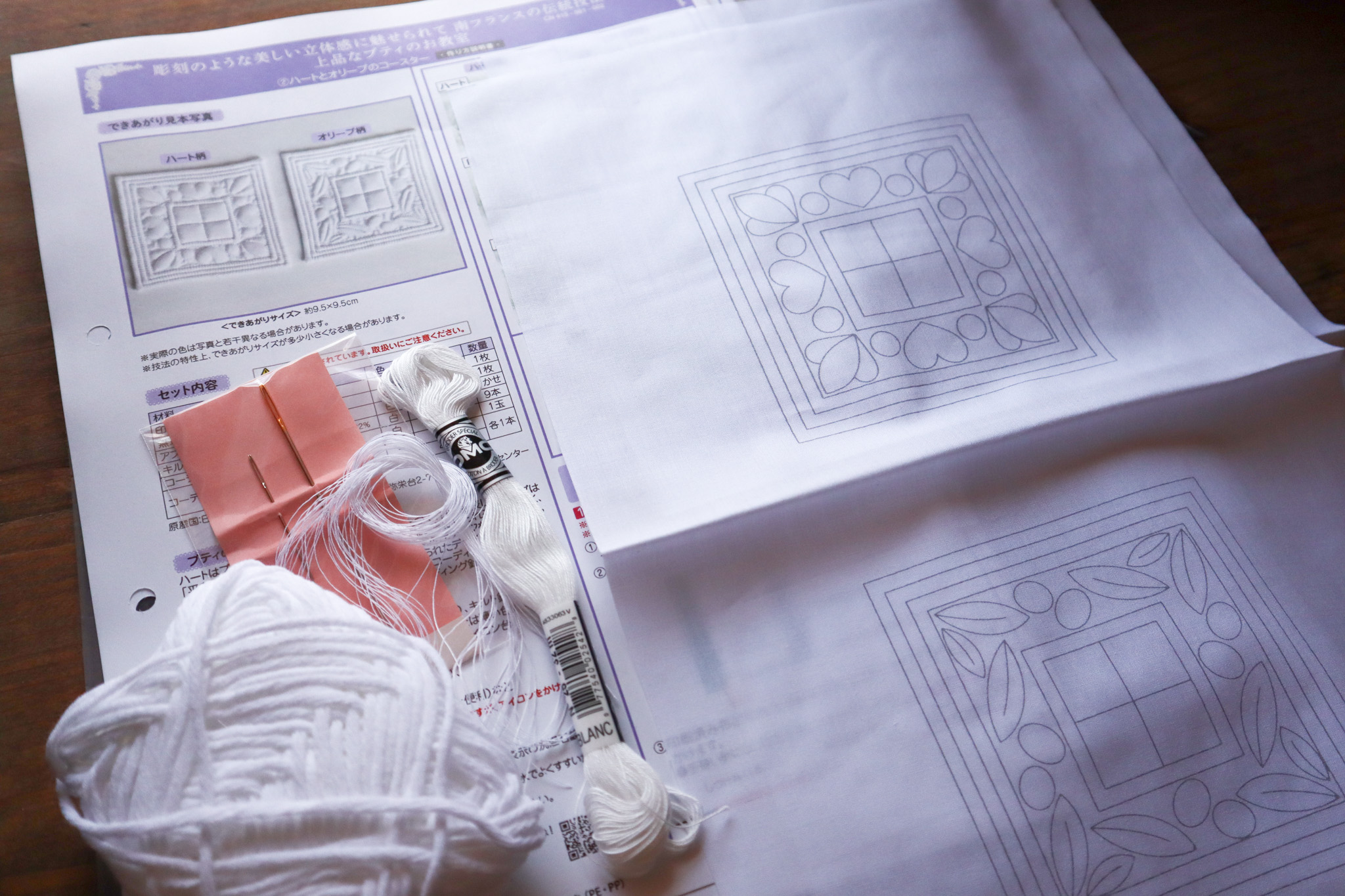 A3二つ折りカラーの説明書が2枚、図案が印刷された刺繍用の表地1枚、裏用の無地布1枚、刺繍糸1カセ、キルト糸9本、コーディング用糸1玉、コーディング用針2本(94mm、42mm各1本) がセットになっていました。