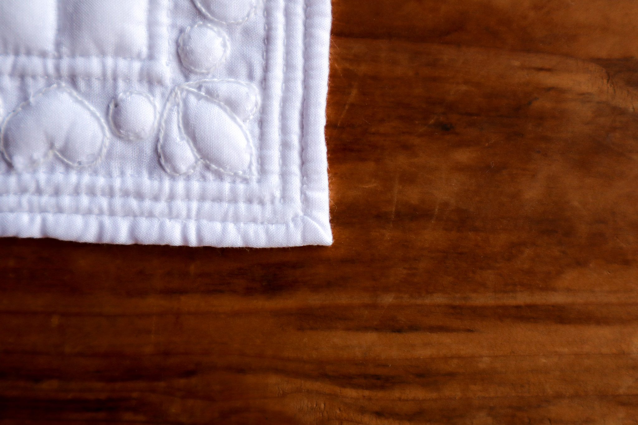 説明書には、角を額縁始末で処理する方法が書いてあったので挑戦してみましたが、なかなか難しかったです。