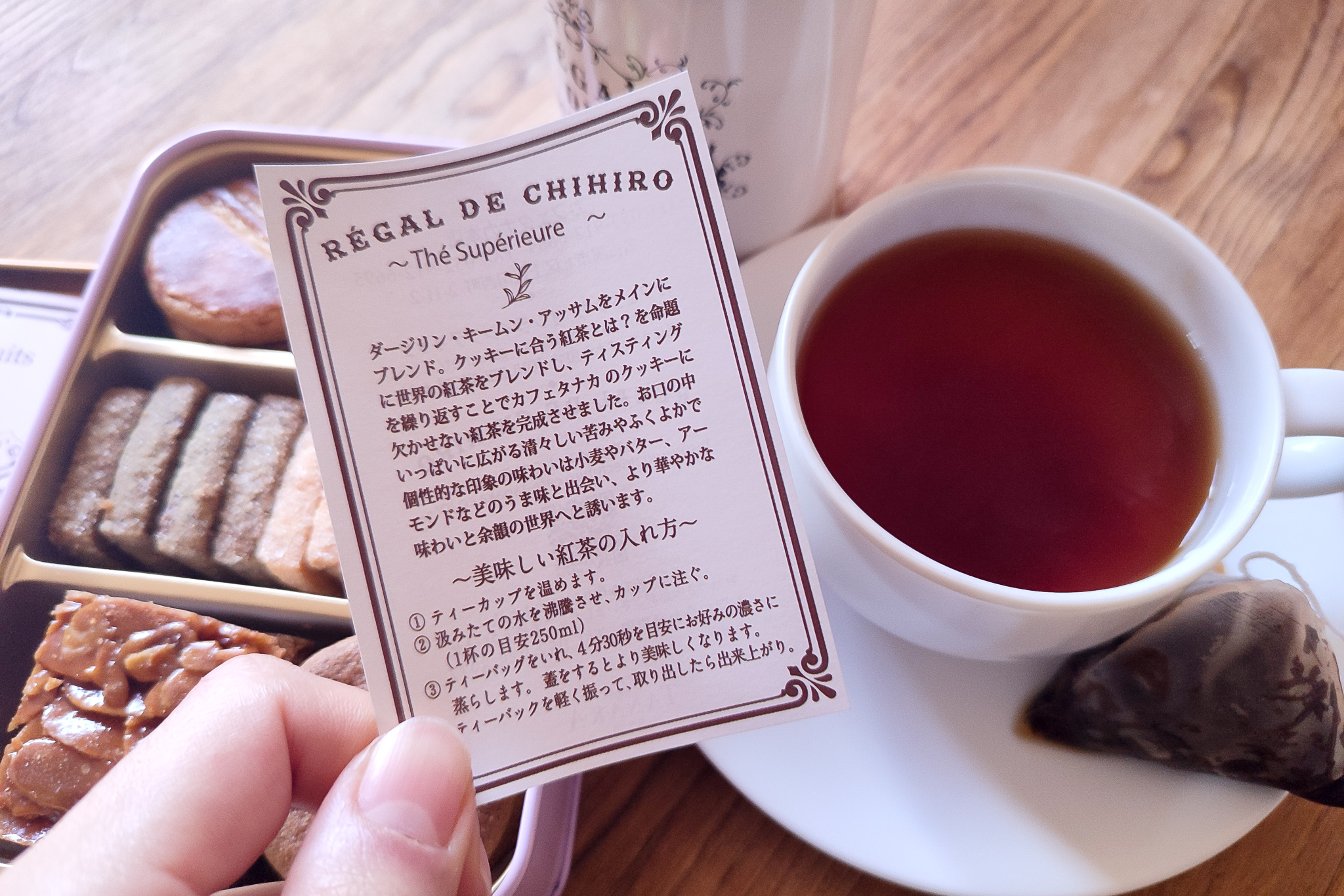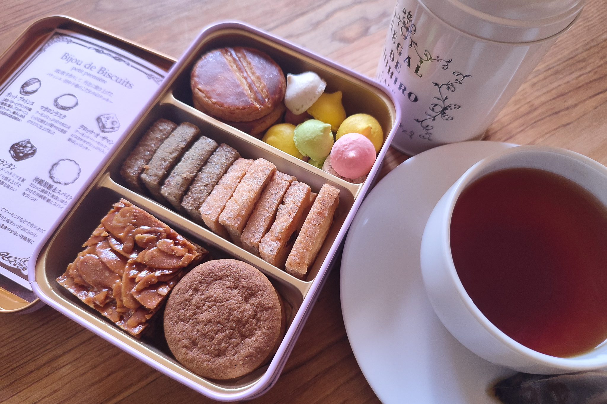購入したのは、ビジュー・ド・ビスキュイ プティプルミエ缶(ピンクの小さいクッキー缶)×2、アソルティ アン(焼き菓子)、レガル・ド・チヒロ テ・スーペリュール(紅茶)の4つ。