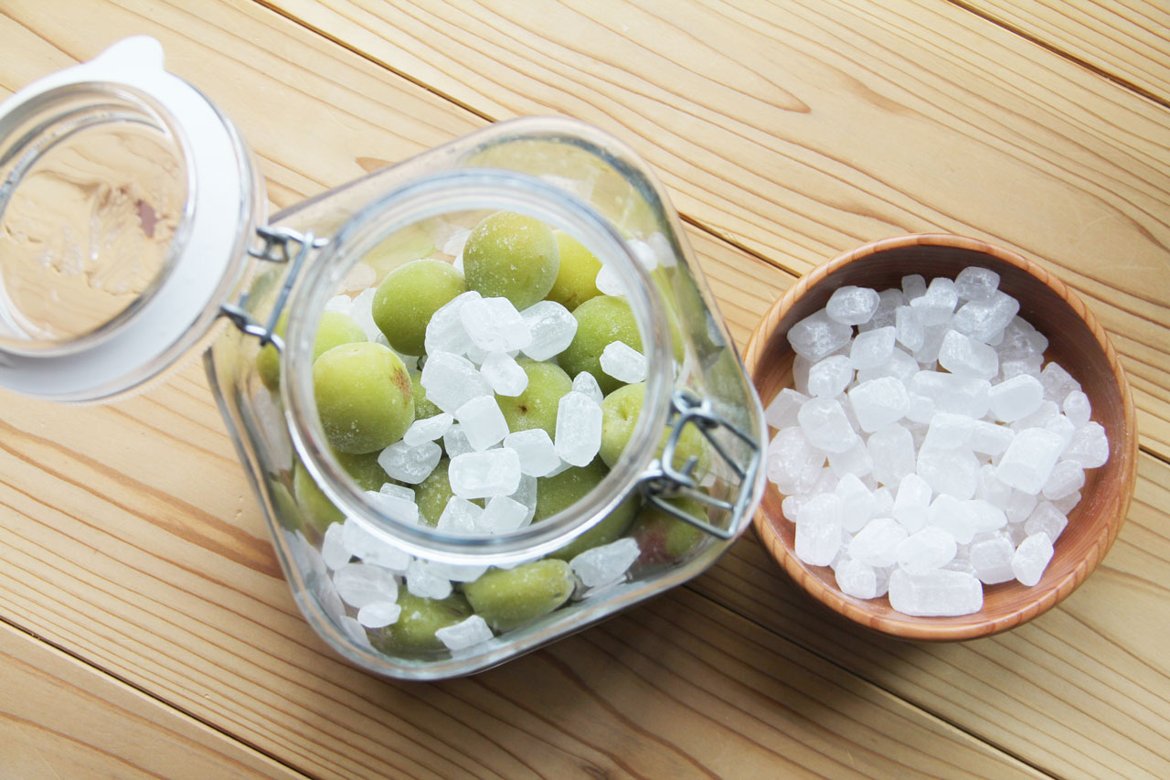 ヘタが取れたら、梅! 氷砂糖! 梅! 氷砂糖! と、梅と氷砂糖を交互に保存瓶(煮沸して冷ましたもの)に詰めます。