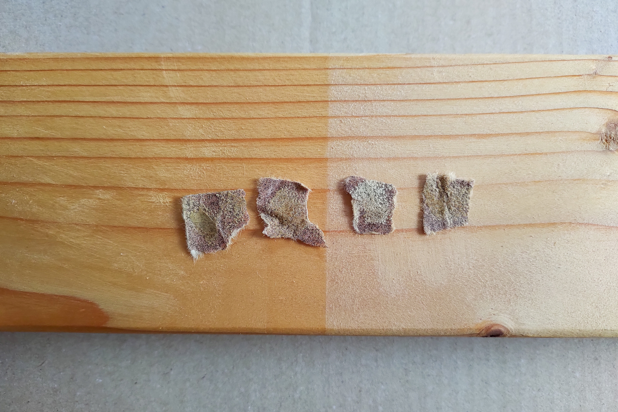 サンプルが小さくて分かりづらいですが、水拭き、水+台所用中性洗剤、何もしていない(蜜蝋ワックスを塗った)状態だと蜜蝋が溶けて紙やすりがすぐダメになるのに対して、水+台所用中性洗剤+重曹はちゃんと粉の状態