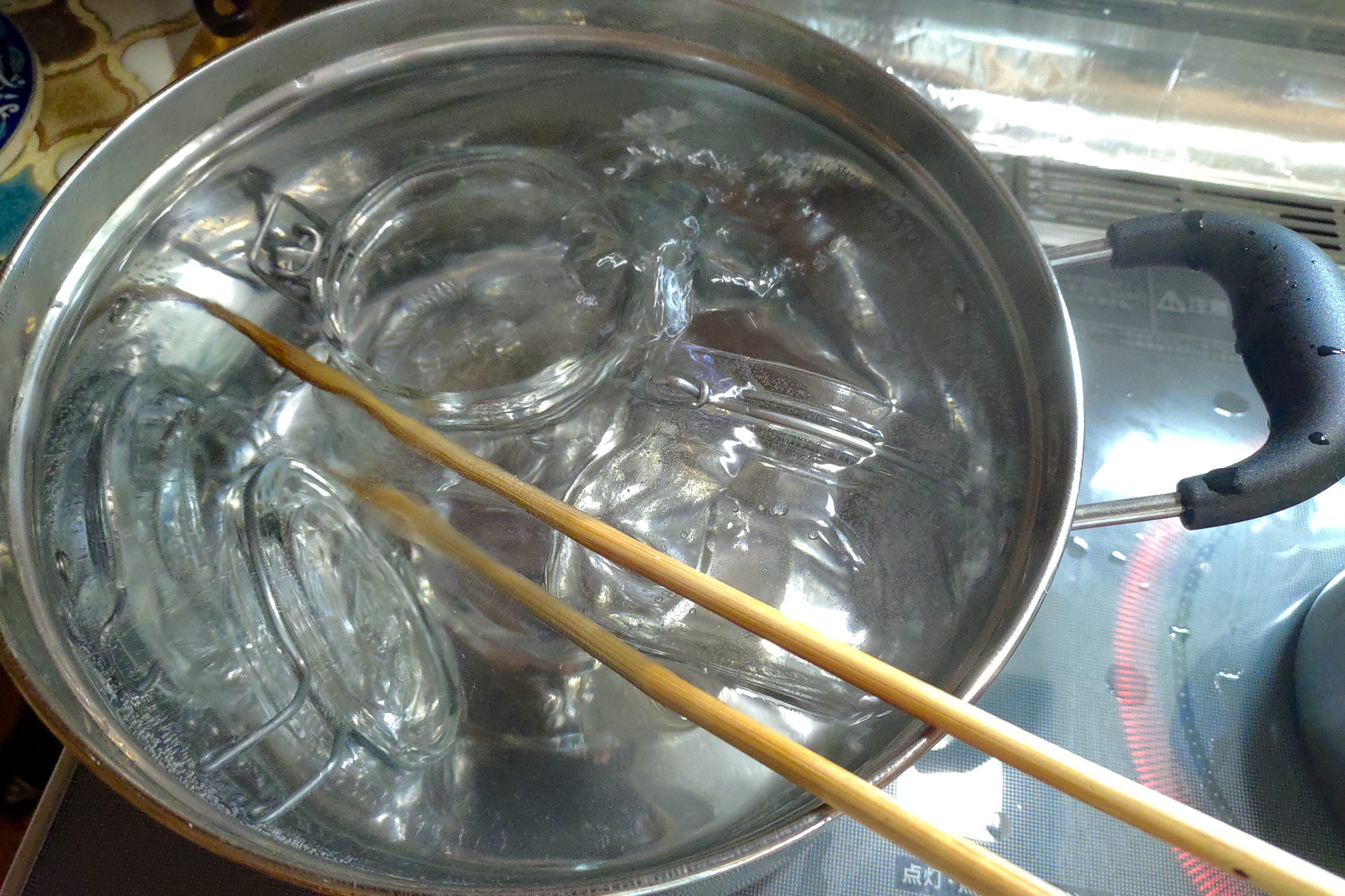 小さなガラスの容器は煮沸消毒していきます。