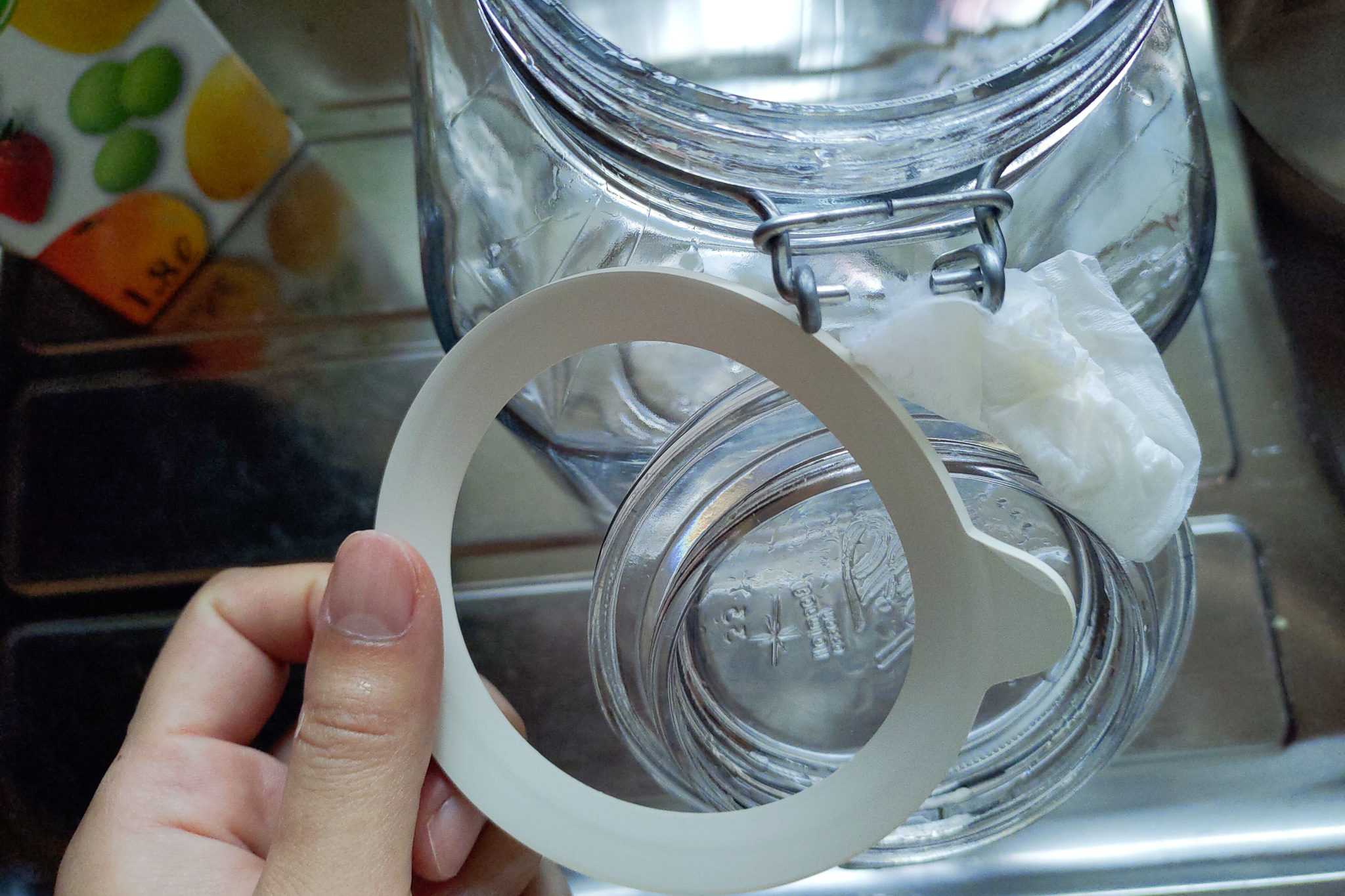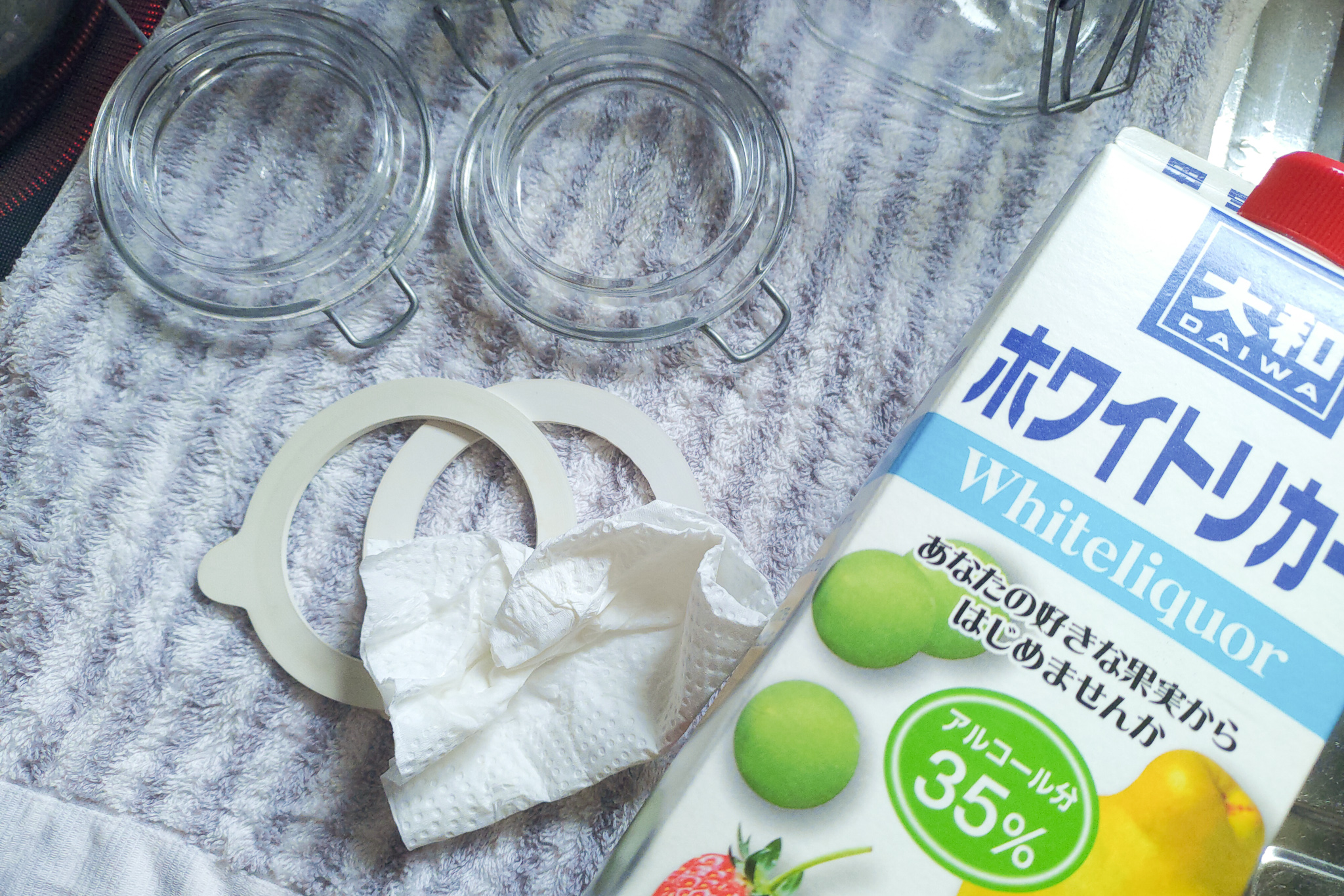 パッキンは食器用洗剤とスポンジできれいに洗って乾かした後、ホワイトリカーを染み込ませたキッチンペーパーで拭いて消毒します。