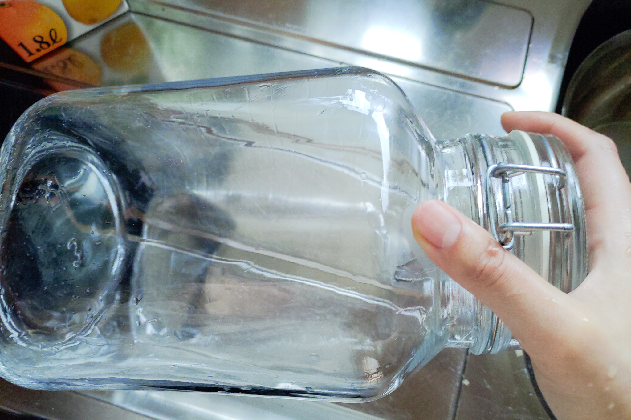 いったん伏せて容器の中に入っている水分を出し切ってから、口を上に向けて乾かします。
