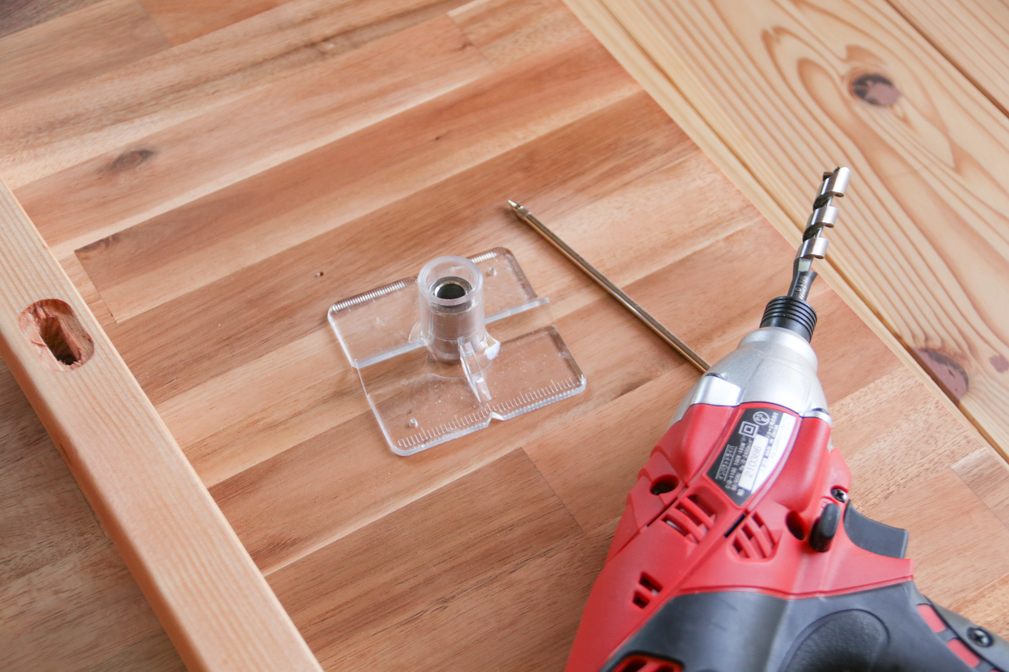 天板の裏側に下穴を開けます。今回は脚がくる部分とバランスを見ながら位置を決めました。位置が決まったらドリルガイドを使って下穴の位置に点で印をつけます。