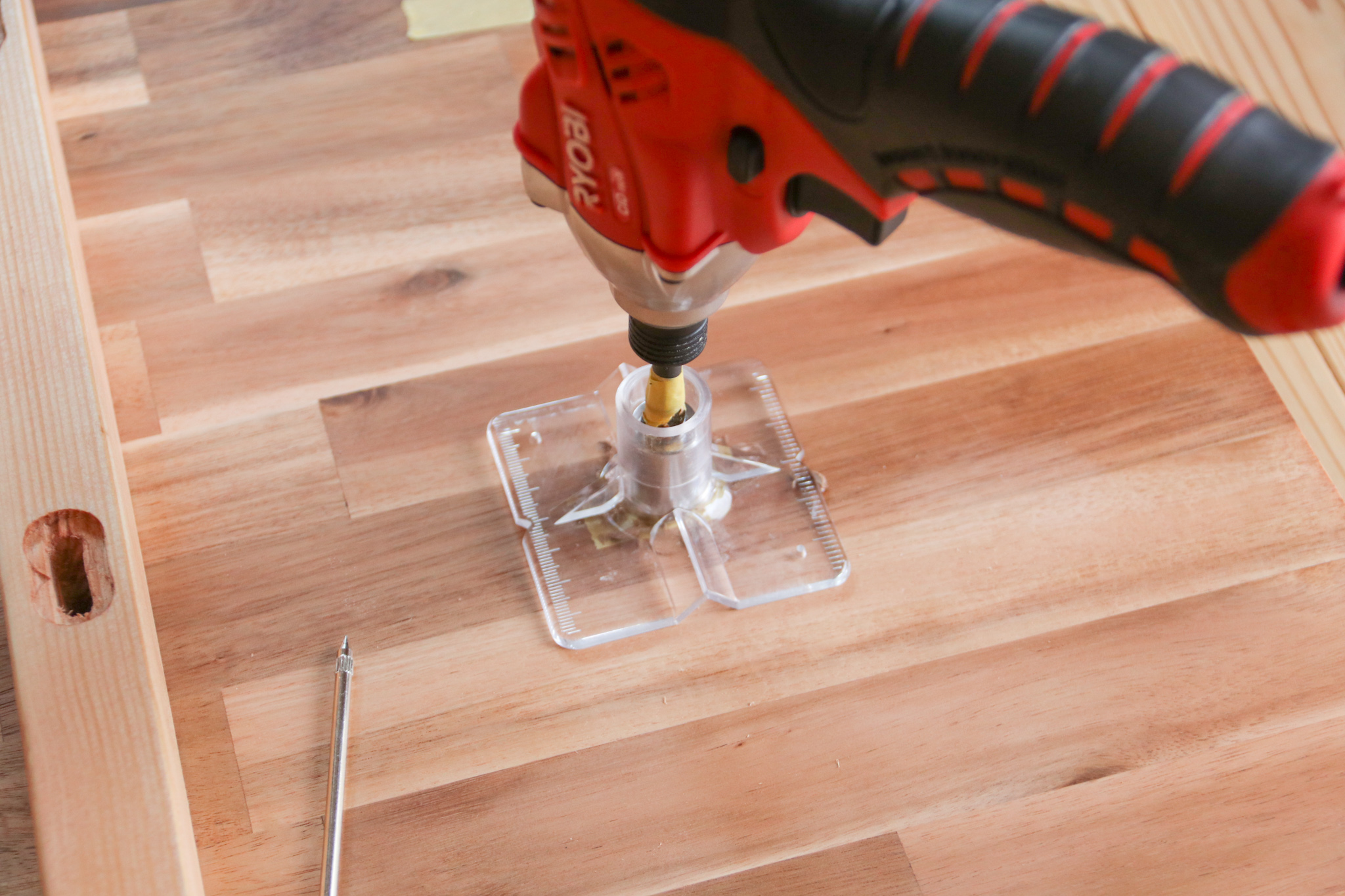 ここで鬼目ナットをつけてみて深さが足りないようであれば、追加でさらに深く削ってください。