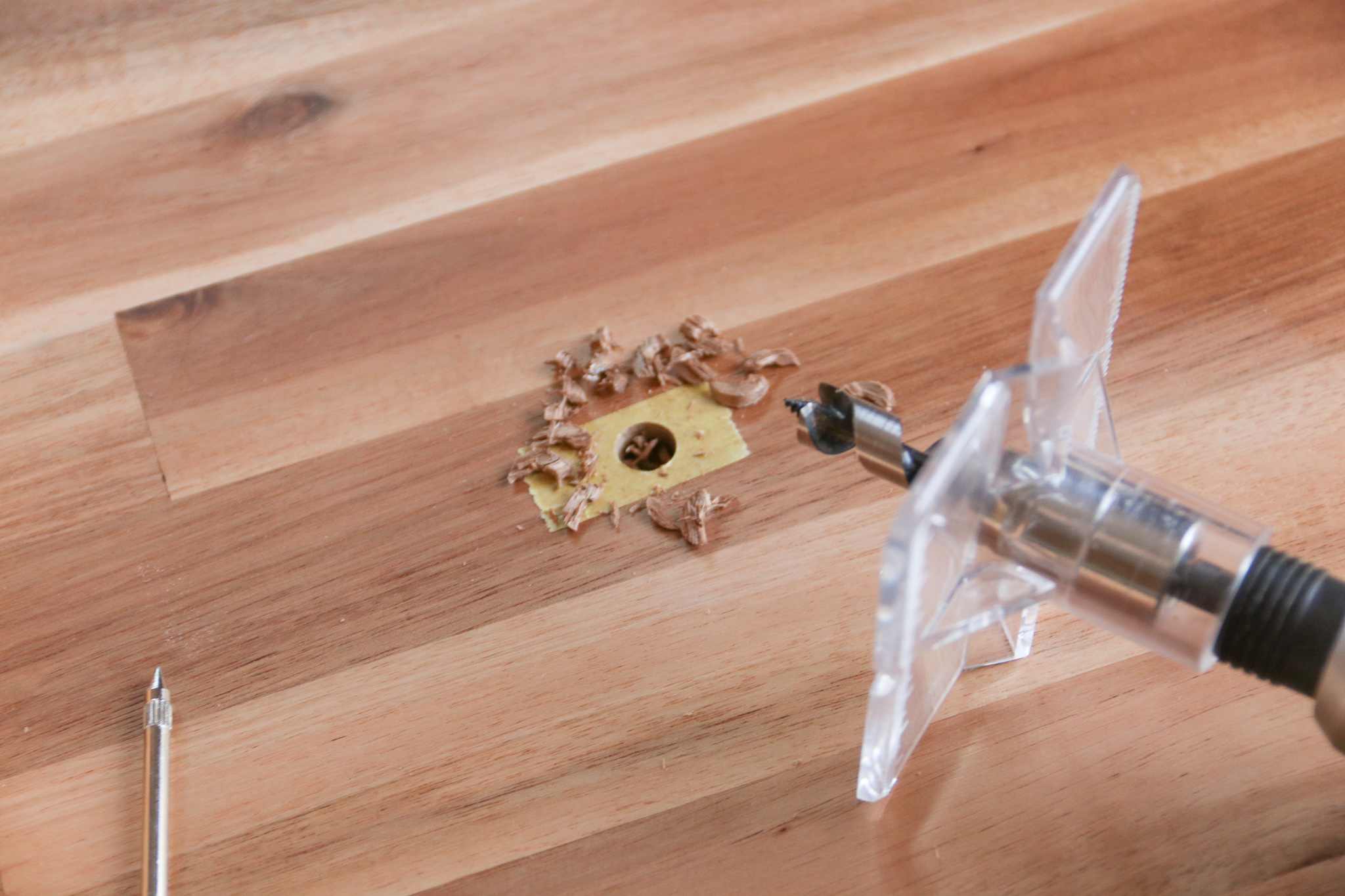 下穴の位置を決めたら、今度は下穴の深さの確認をします。うっかり貫通しないように、ビットにマスキングテープで印をつけておくと安心です。深さが足りなければ、また削ればいいだけの話なので慎重に。