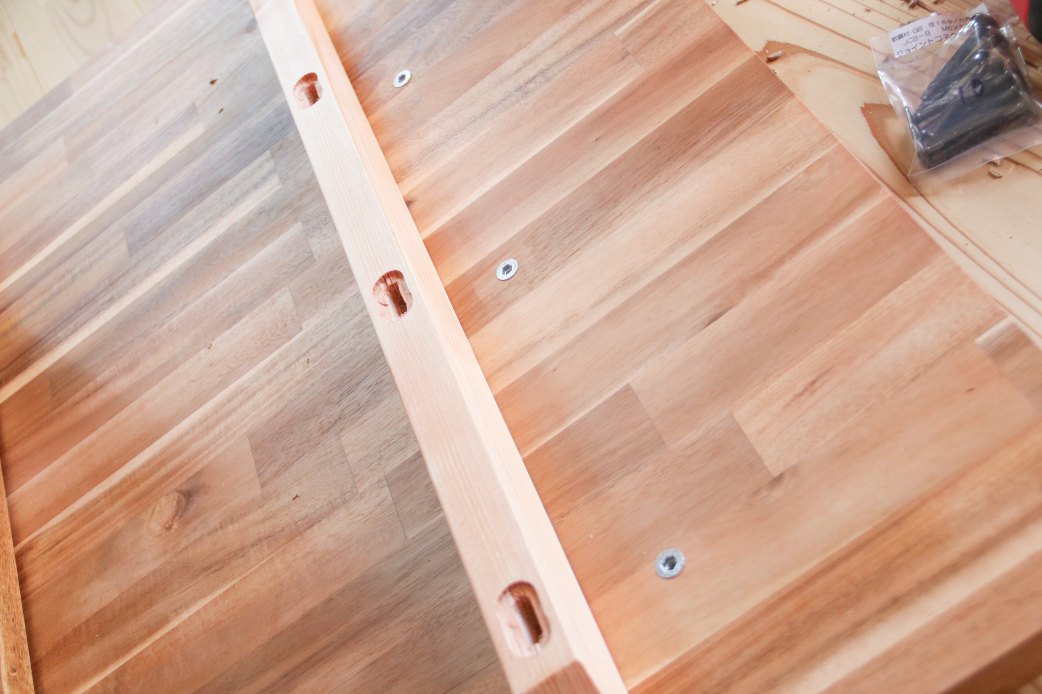 ジョイントコネクターボルトを使って、反り止めと天板を固定します。