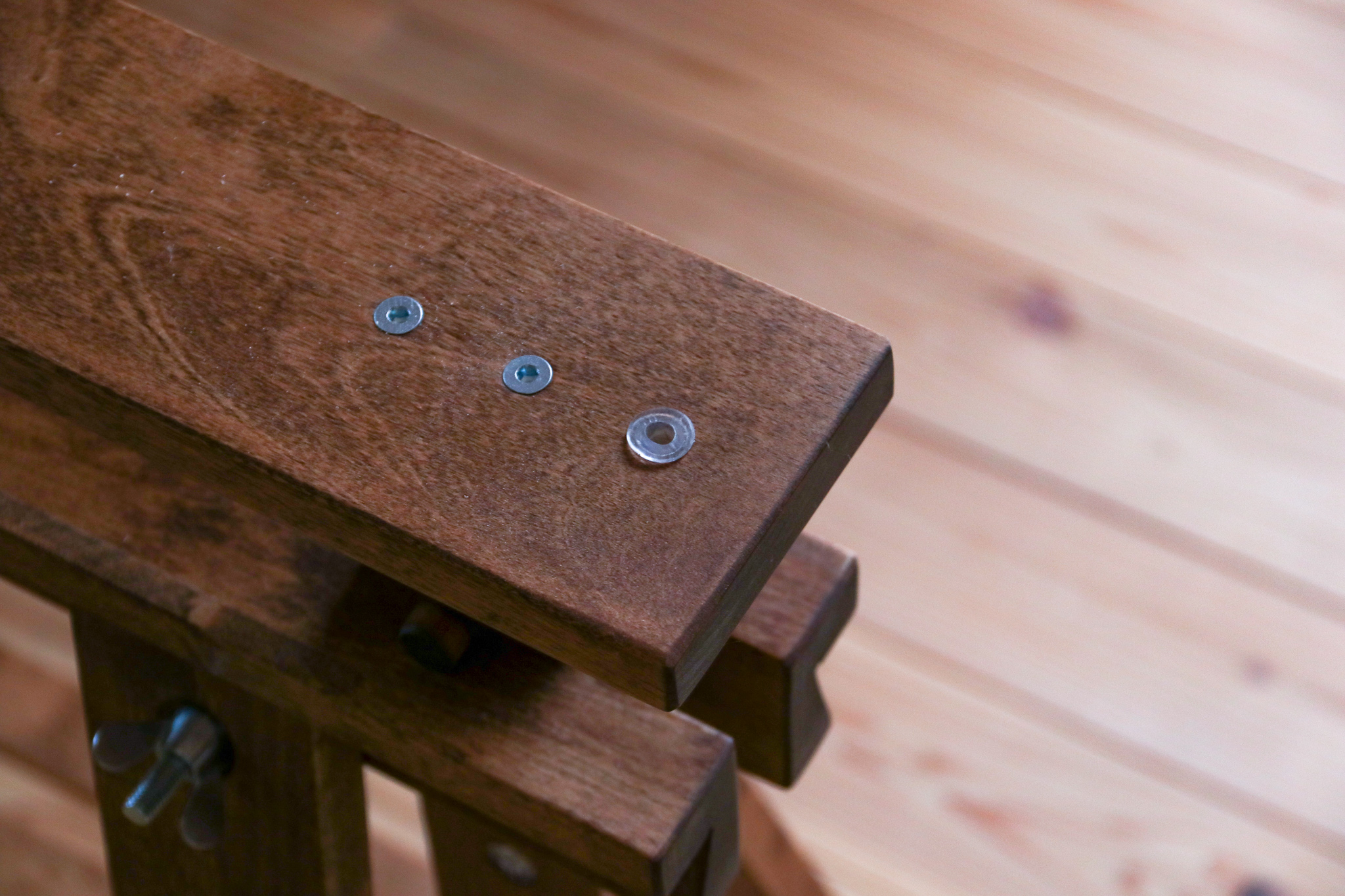 この鬼目ナットと、ジョイントコネクターボルトで反り止めと天板を固定します。
