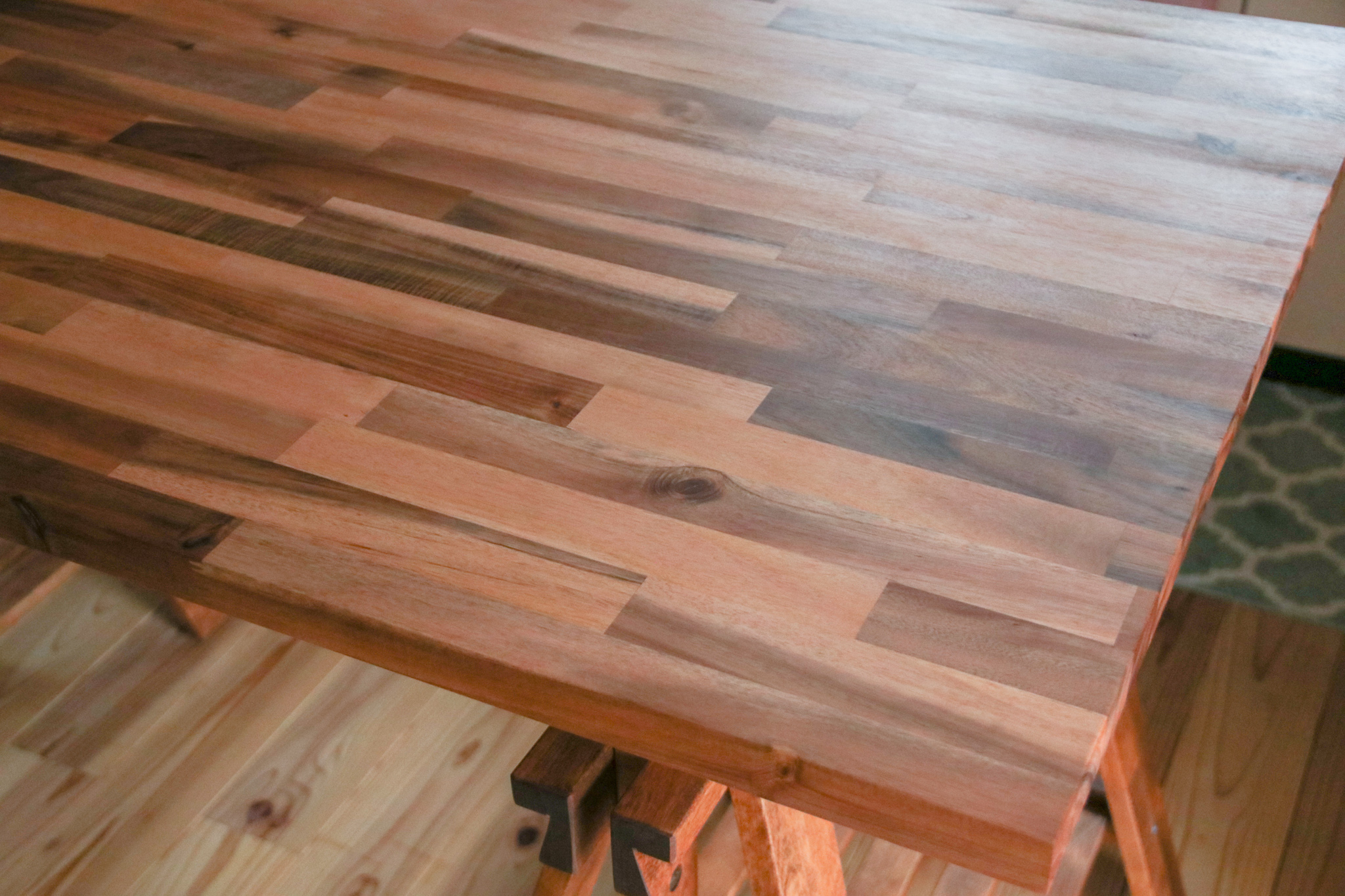 今回は、脚は既製品、天板もサイズ指定してカットしてもらっていたのでそこまで大変には感じませんでした。しいて言うなら、前回の記事の反り止めに開ける穴をノミで貫通させるが大変だったかなと(笑)