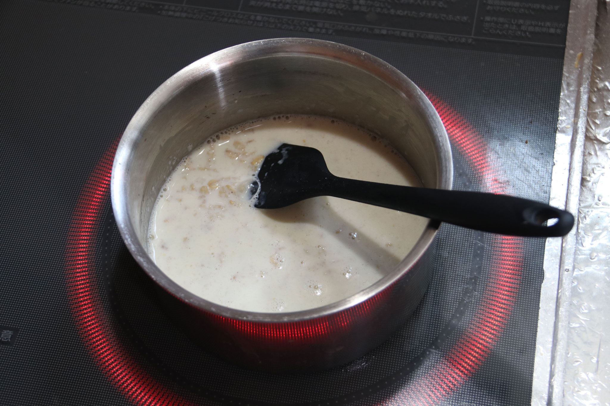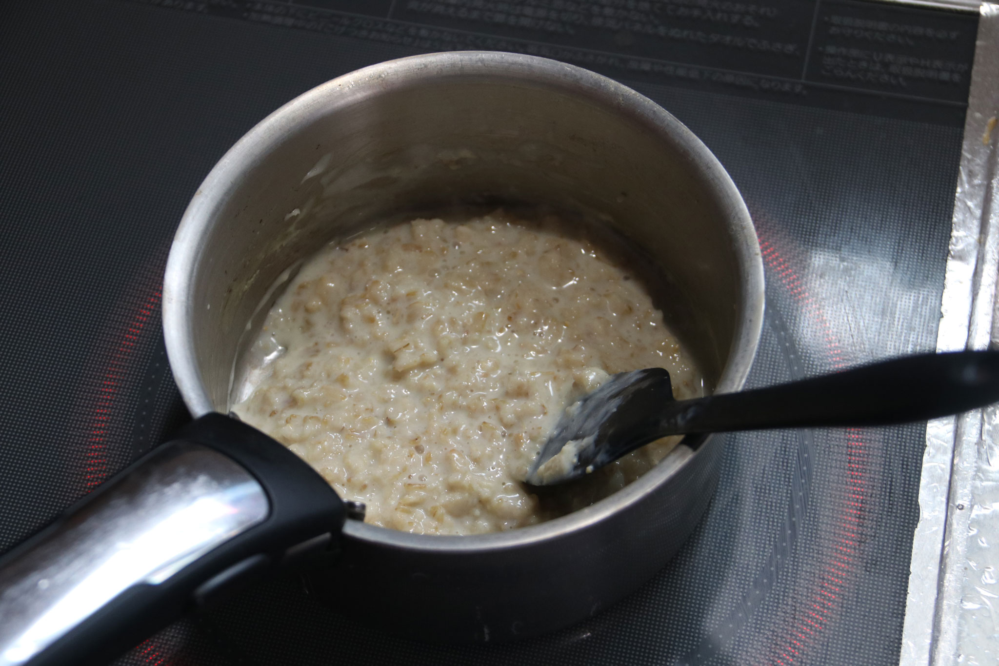 鍋にオートミール、豆乳、水を入れて火にかけます。砂糖を入れる場合はここで一緒に。